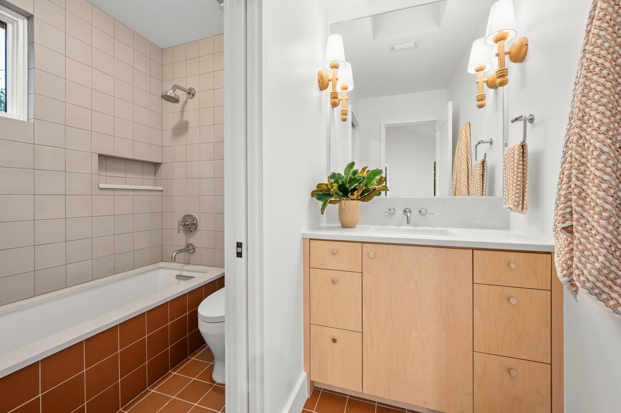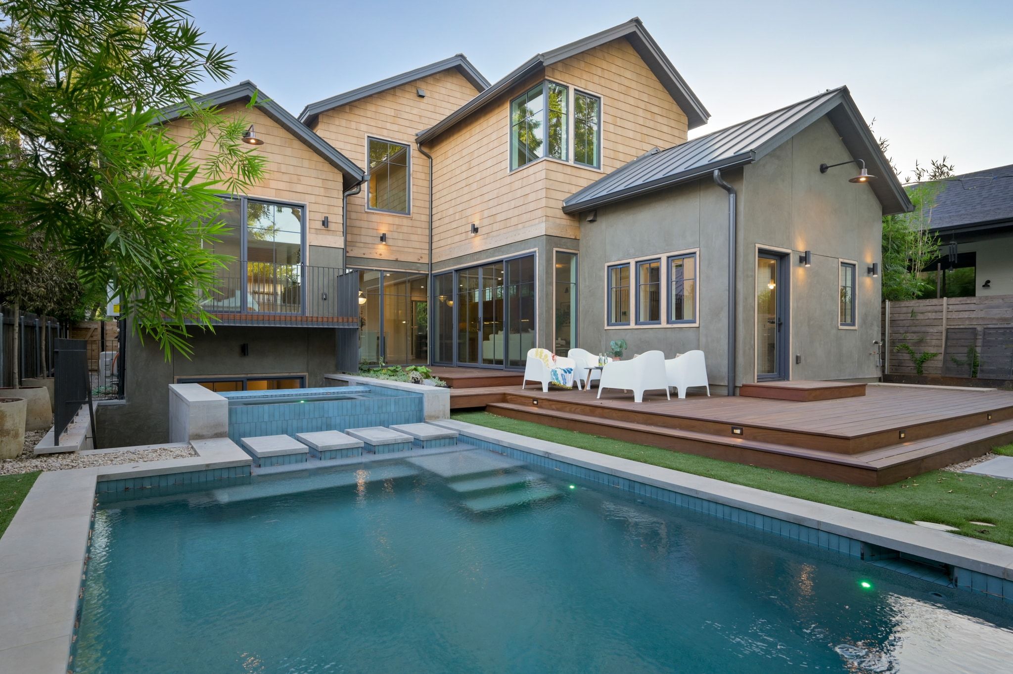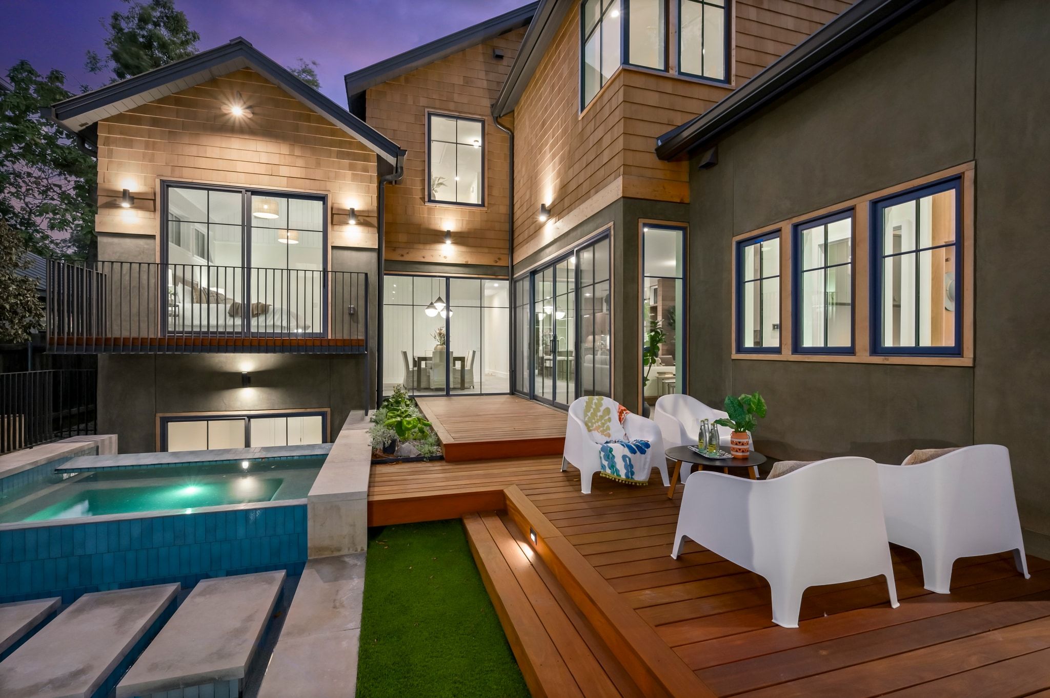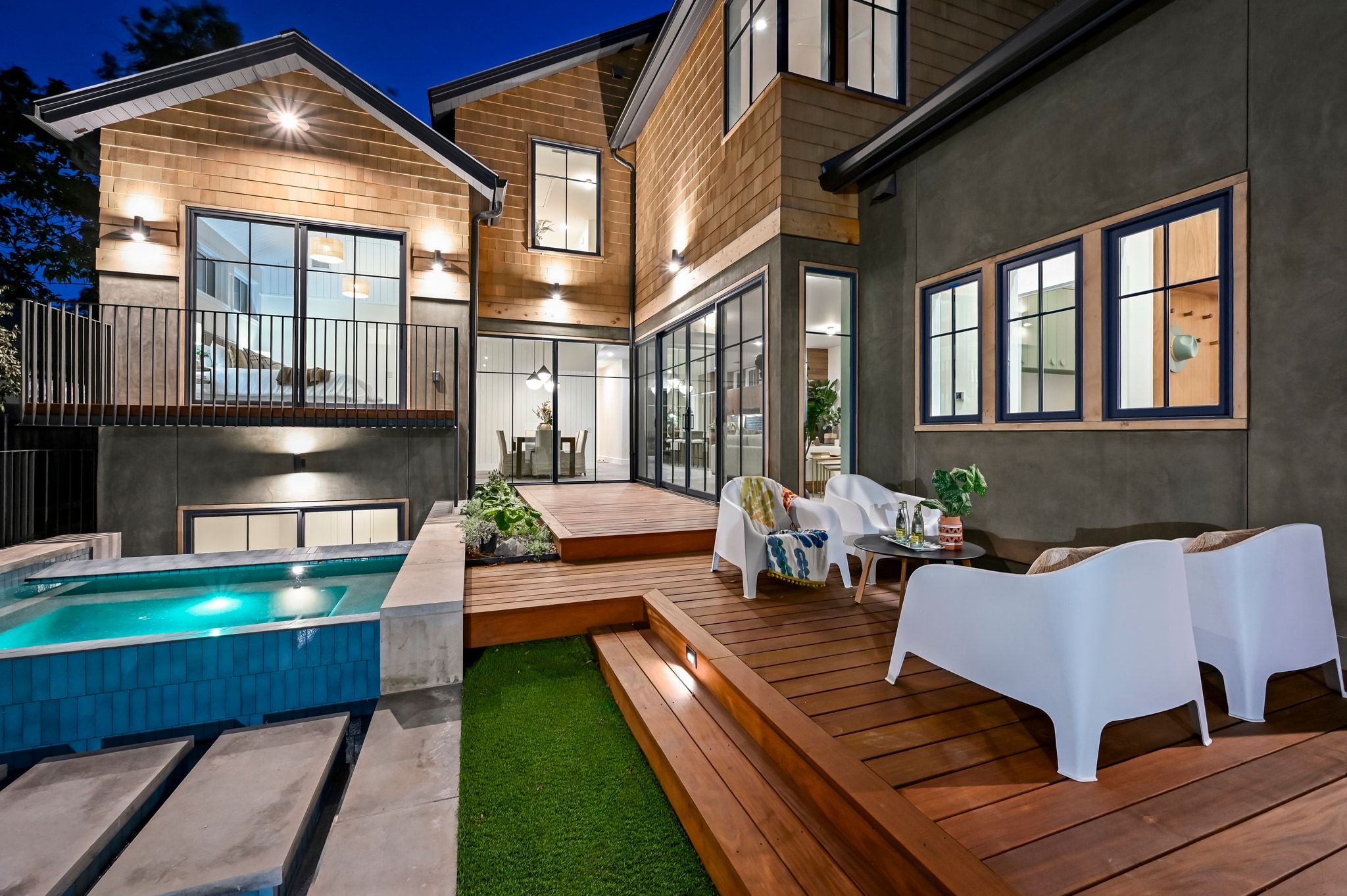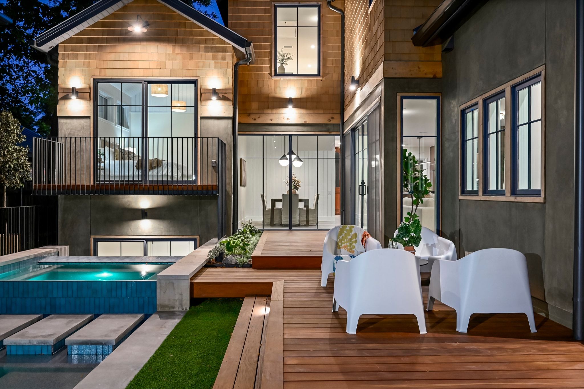 The home features 5 bedrooms and 5.5 bathrooms in total, including a 4-bedroom, 4.5-bathroom main home and a 1-bedroom, 1-bathroom detached casita complete with its own full kitchen. A two-car garage provides convenience, while the pool, spa, and lush landscaping transform the backyard into an everyday escape. The primary suite offers a private retreat, lifted just above the basement to overlook the pool and waterfall below, creating an elevated vantage point that feels both serene and connected. The three secondary bedrooms offer ensuite bathrooms and curated designer details.